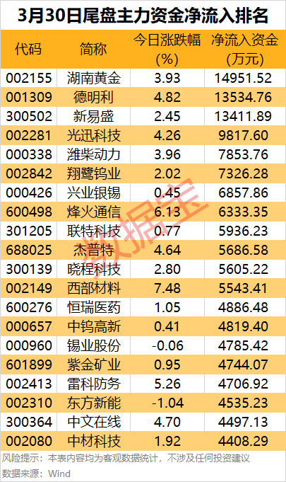 此外,德明利、新易盛、光迅科技、潍柴动力和翔鹭钨业等尾盘主力资金净流入金额居前。