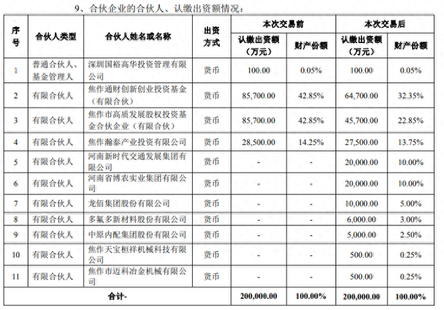 本次份额转让前,焦作通财持有河南空天产业基金8.57亿元认缴出资额,占比42.85%。本次转让中,焦作通财将合计10.5%未出资份额分别转让给龙佰集团(10000万元,占比5%)、多氟多(6000万元,占比3%)、中原内配(5000万元,占比2.5%),转让后焦作通财仍持有该基金6.47亿元认缴出资额,占比32.35%。除上述三家企业外,河南空天产业基金的合伙人还包括焦作市高质发展股权投资基金合伙企业(有限合伙)、焦作瀚泰产业投资有限公司、河南新时代交通发展集团有限公司、河南省博农实业集团有限公司等,各合伙人认缴出资额及占比均已明确。