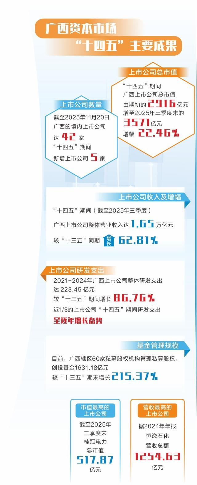 “十四五”期间,广西资本市场实现跨越式发展,交出了一份可圈可点的成绩单:新增上市公司5家,直接融资规模突破3000亿元,私募基金净值规模增长超千亿元。这一系列数字背后,是资本市场与实体经济深度融合的生动实践,更是广西加快建设现代化产业体系的生动注脚。