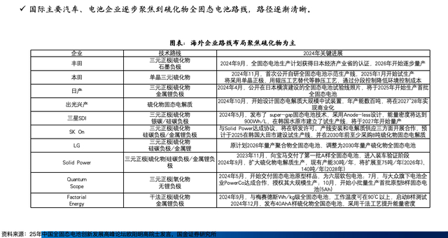 天风证券研究所副所长、新材料研究院院长鲍荣富也表达了类似的观点,即硫化物有望成为固态电池主流技术路线,宁德时代、比亚迪、蜂巢能源、太蓝新能源等企业已全面布局硫化物路线,丰田、三星SDI等国外巨头也加速技术攻关与量产规划。全球电池厂进入“工程冲刺”阶段,2026—2027年是关键量产节点,国内外头部企业均锁定2027年实现小规模量产。