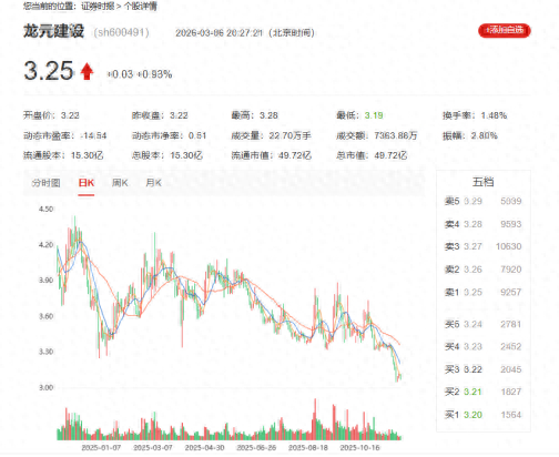 尽管公司作出风险可控的表态,但从股票市场走势来看,龙元建设的表现却不容乐观。最近一年多以来,公司股价总体呈持续下行态势,截至2026年3月6日收盘,股价报3.25元/股。