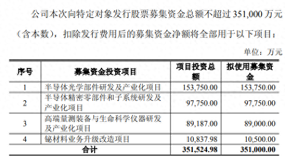 本次募集资金将精准投向四大主业相关项目,其中半导体光学部件研发及产业化项目拟投15.375亿元,半导体精密零部件和子系统研发及产业化项目拟投9.775亿元,高端量测装备与生命科学仪器研发及产业化项目拟投8.9亿元,铋材料业务升级改造项目拟投1.05亿元,项目总投资合计35.15亿元,差额部分由公司自筹解决。四大项目建设周期均为36个月,实施主体均为公司全资子公司。