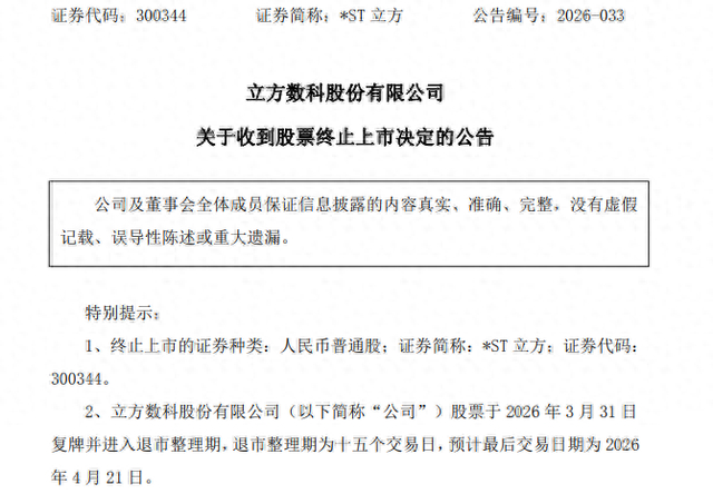 *ST立方已于2月24日停牌,按照相关规定,公司股票将于2026年3月31日复牌并进入退市整理期,退市整理期为十五个交易日,预计最后交易日期为2026年4月21日。退市整理期间,公司股票在风险警示板交易,首个交易日股票价格无价格涨跌幅限制,此后每日涨跌幅限制为20%。