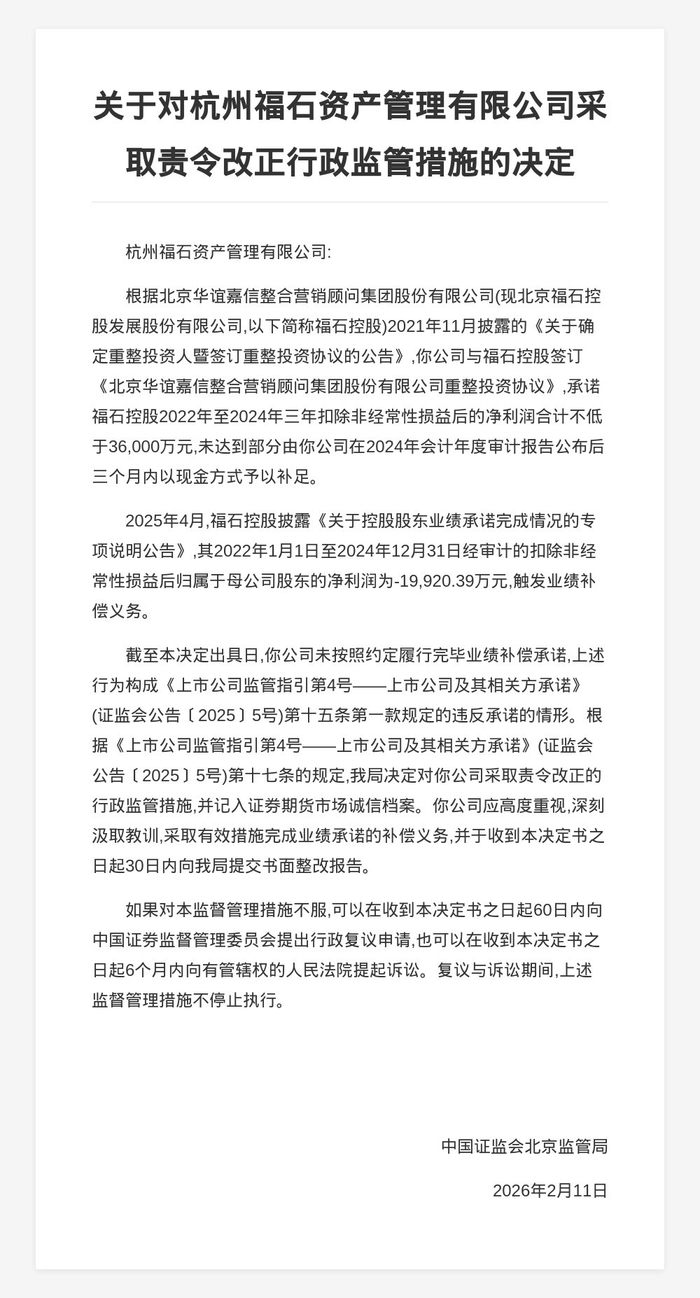 决定书显示,根据北京华谊嘉信整合营销顾问集团股份有限公司(现北京福石控股发展股份有限公司,以下简称福石控股)2021年11月披露的《关于确定重整投资人暨签订重整投资协议的公告》,公司与福石控股签订《北京华谊嘉信整合营销顾问集团股份有限公司重整投资协议》,承诺福石控股2022年至2024年三年扣除非经常性损益后的净利润合计不低于36,000万元,未达到部分由公司在2024年会计年度审计报告公布后三个月内以现金方式予以补足。