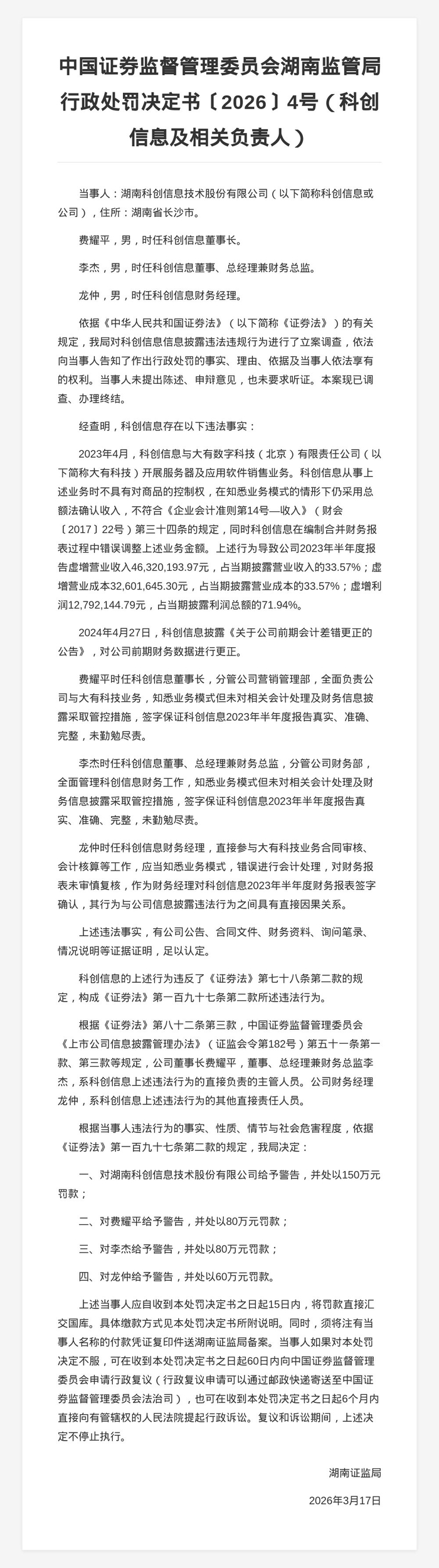 对此,湖南证监局决定对湖南科创信息技术股份有限公司给予警告,并处以150万元罚款;对费耀平给予警告,并处以80万元罚款;对李杰给予警告,并处以80万元罚款;对龙仲给予警告,并处以60万元罚款。