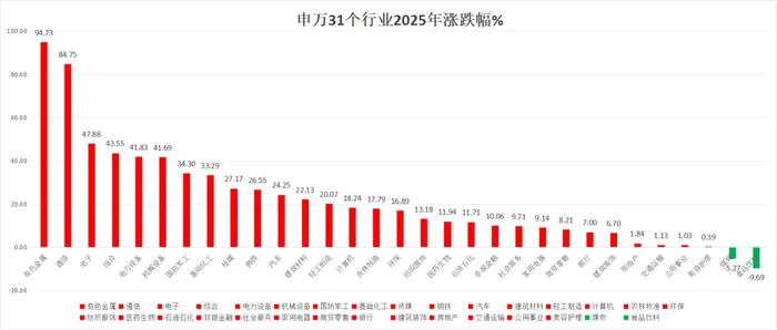 截至2025年12月31日,在申万31个一级行业中,有色金属板块表现一骑绝尘,以年度涨幅94.73%的绝对优势,显著领先于其他行业。以市面规模最大的有色金属ETF(512400)为例,其跟踪的中证申万有色金属指数(000819)年内上涨16.86%(数据来源Wind:同花顺;截至1月22日)。