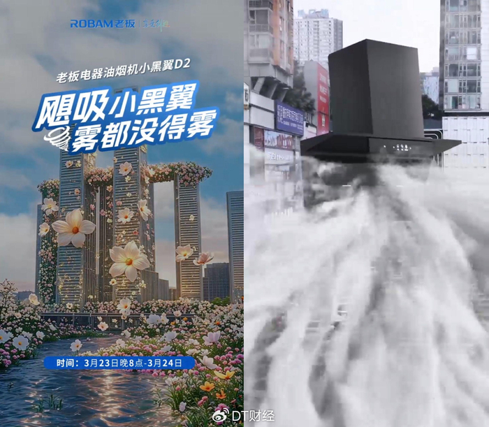其旗下小黑翼 D2 油烟机主打强悍吸力,目标人群定位为追求生活掌控感的摩登青年。品牌洞察到重庆 “雾都” 的城市特质 —— 烟雾缭绕且美食文化浓厚,与厨房油烟场景高度契合,于是打造了一支超现实 CGI 创意视频,直接将小黑翼 D2 置于山城浓郁烟雾中,展示强悍吸排能力,将产品功能可视化、场景化,强化 “多大烟雾都能吸” 的用户认知。