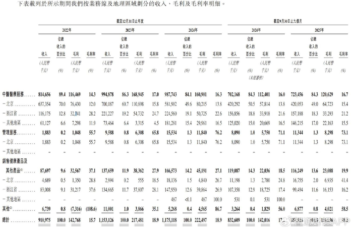 内生增长韧性十足:中医医疗服务是该公司核心业绩来源,在外部环境承压下,其业务收入增长稳健,贡献往年核心增长,特别是毛利润占比近八成。值得注意的事,该业务过往主要分布在北京、浙江和上海三个地区,近期其他地区业务收入份额也呈现走高趋势,从2022年的6.6%提升至2025年前三季度的17%,展现了该公司业务扩张的成效。