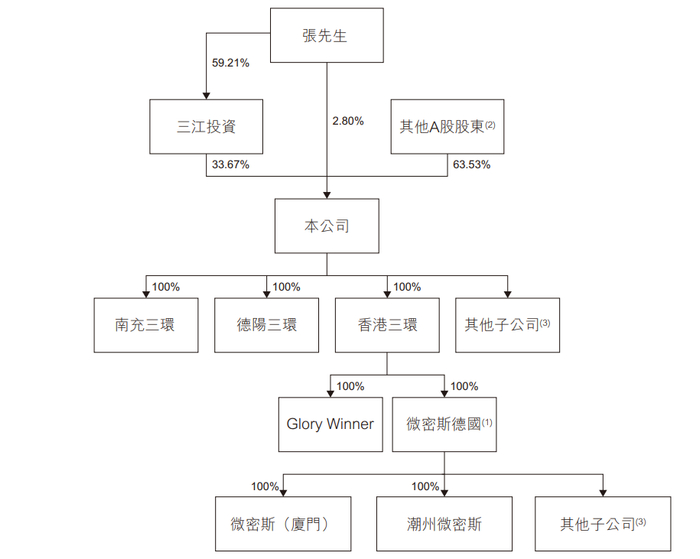 截至最后实际可行日期,张先生持有三江投资约59.21%权益,张先生和三江投资分别持有三环集团约2.8%和33.67%权益。