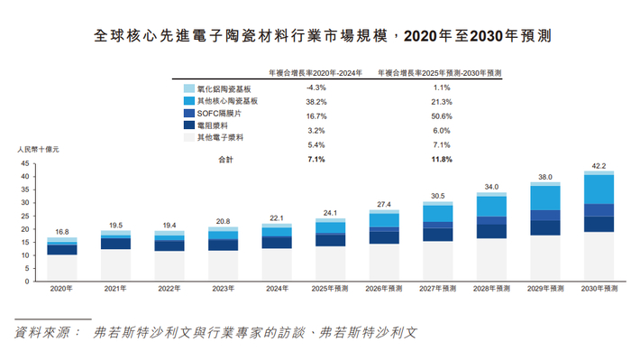 全球核心先进电子陶瓷材料行业市场规模从2020年的人民币168亿元增长至2024年的人民币221亿元,期间年复合增长率达7.1%。展望未来,全球核心先进电子陶瓷材料市场趋势预期将紧密围绕高性能化与新兴应用深化。随著高性能基板材料在功率电子、汽车电驱及高速通信领域的应用,产业正朝着更高导热性、更强可靠度与更高功率密度方向演进。此外,AI、物联网以及新能源等前沿科技领域的快速增长正在释放新的需求,为先进电子陶瓷材料开辟更广阔的应用空间。全球市场预计将从2025年的人民币241亿元增长至2030年的人民币422亿元,期间年复合增长率达11.8%。