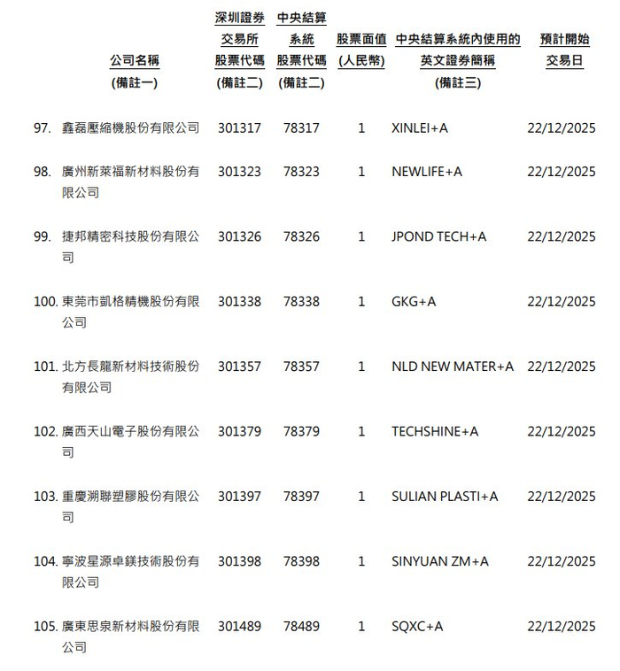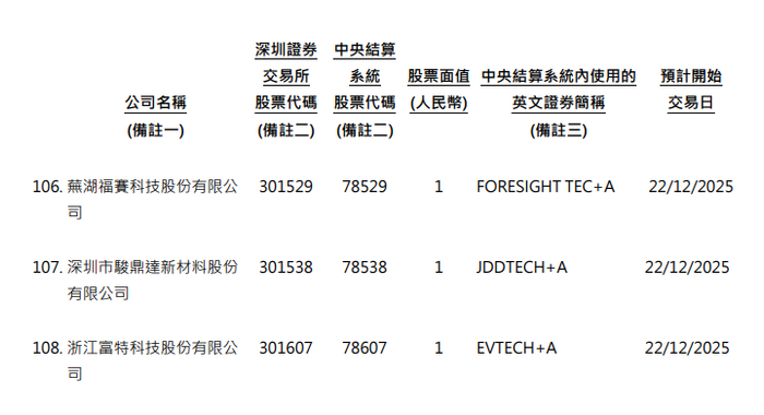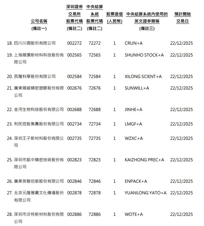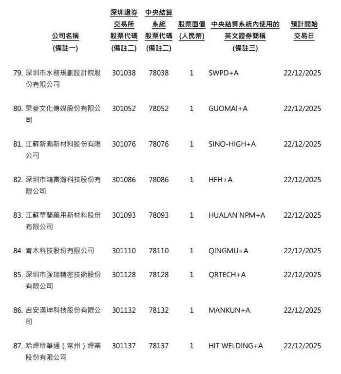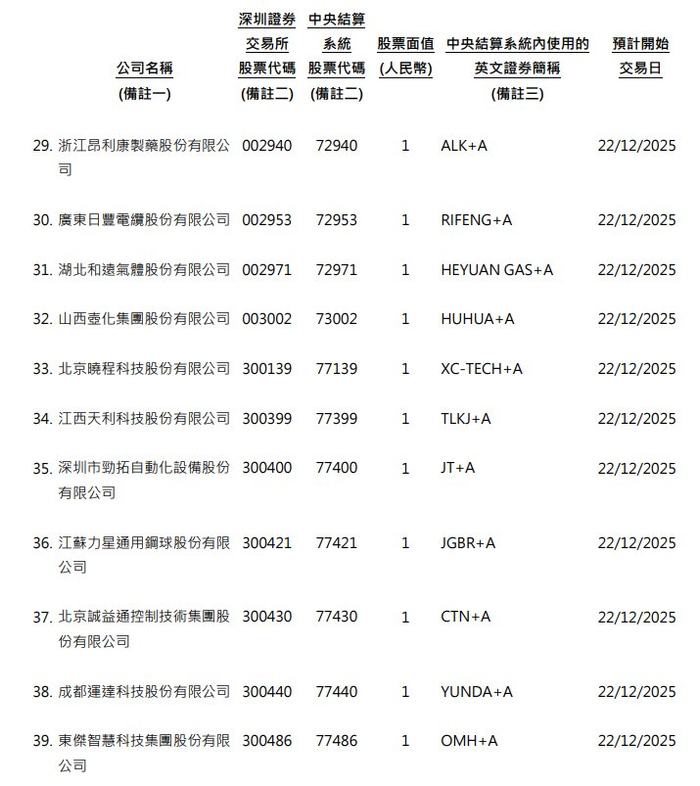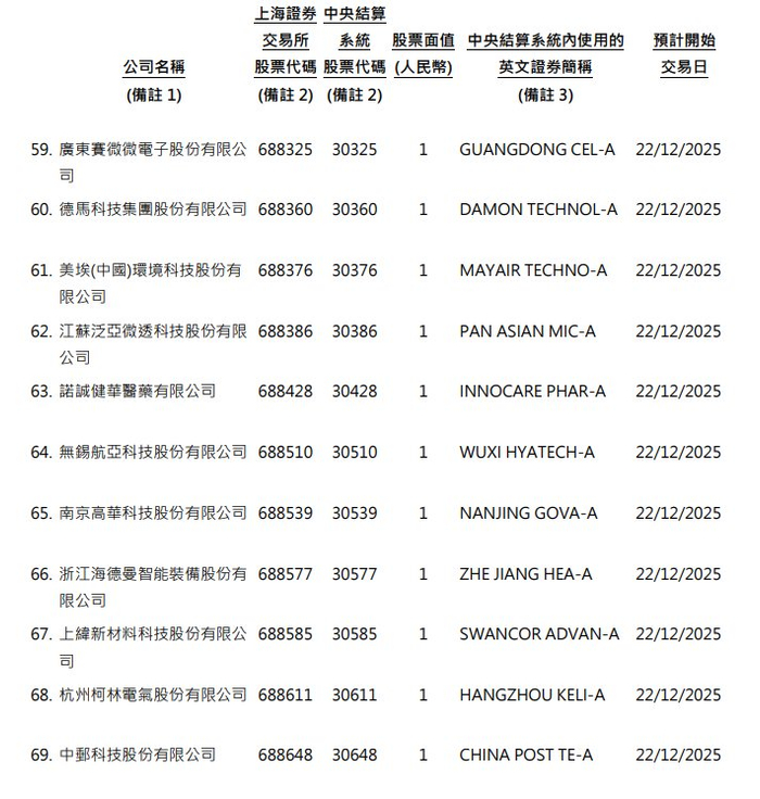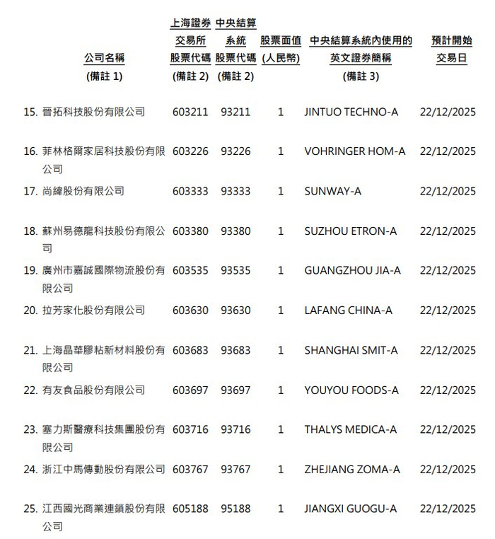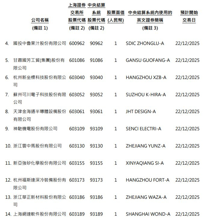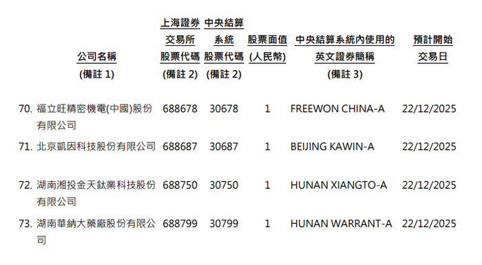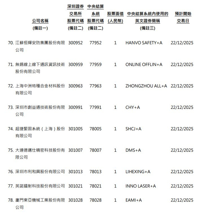 智通财经APP获悉,12月17日,港交所发布公告称,交大昂立(600530.SH)、厦工股份(600815.SH)、耀皮玻璃(600819.SH)等共73只股票获纳入沪股通;飞亚达(000026.SZ)、创元科技(000551.SZ)等共108只股票获纳入深股通,2025年12月22日生效。
