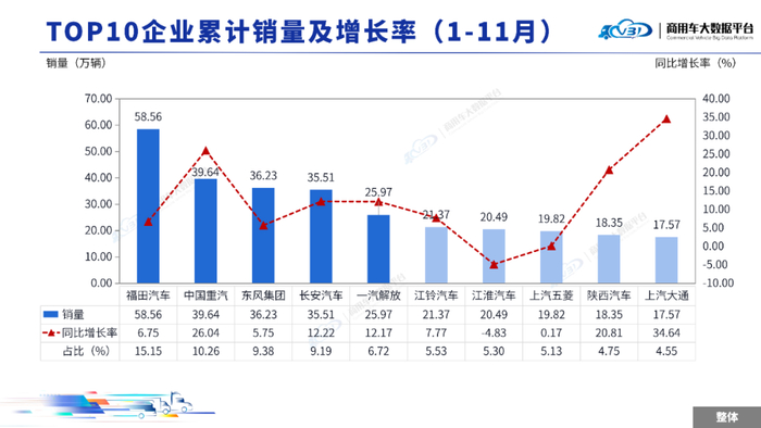1-11月累计TOP5企业销量占比为50.70%,依次为福田汽车、中国重汽、东风集团、长安汽车、一汽解放。