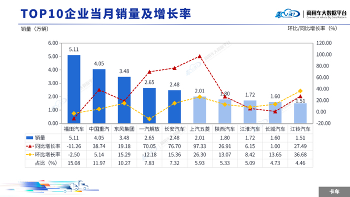 当月TOP5企业销量占比为49.26%,依次为福田汽车、中国重汽、东风集团、长安汽车、一汽解放。