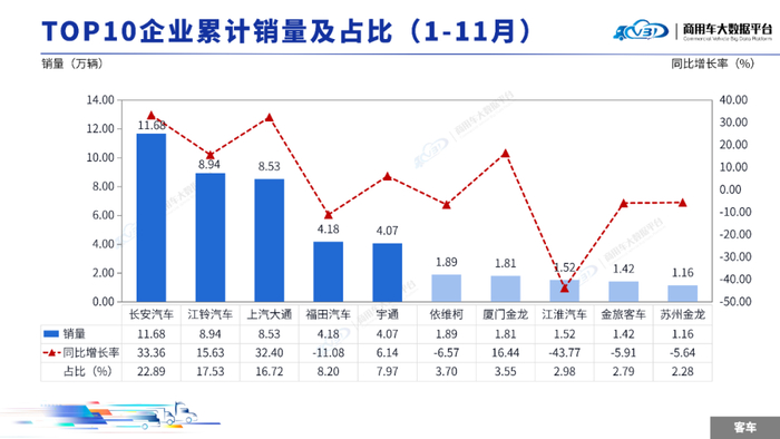 1-11月客车TOP5企业销量占比为73.30%,依次为长安汽车、江铃汽车、上汽大通、宇通、福田汽车。