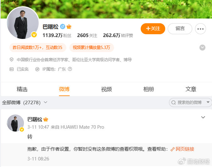 巴曙松在微博上拥有超过1139万的粉丝,日常更新非常频繁,他的最后一条微博更新时间是2026年3月11日10时许,此后再无更新。