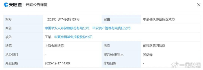 天眼查信息显示,平安系最近起诉华夏幸福及王某,案由为申请确认仲裁协议效力。案件将于12月17日14时在上海金融法院开庭。