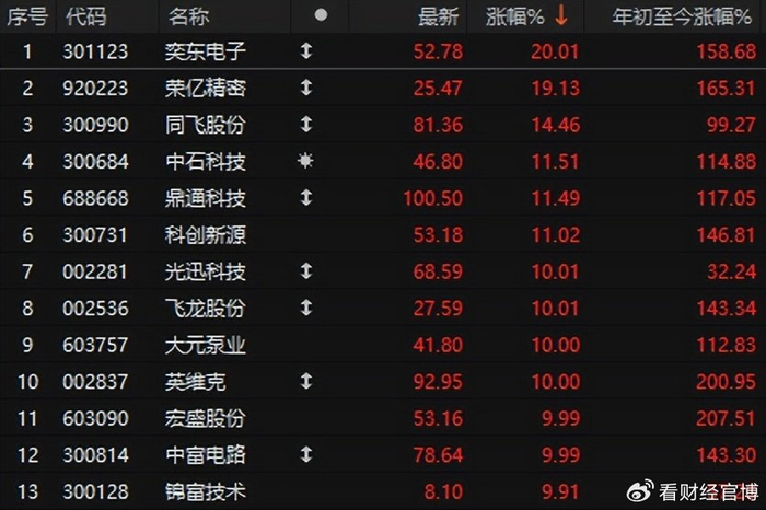分行业来看,通信、有色金属、电子、基础化工、电力设备等行业领涨,农林牧渔、国防军工、煤炭三大行业下跌。