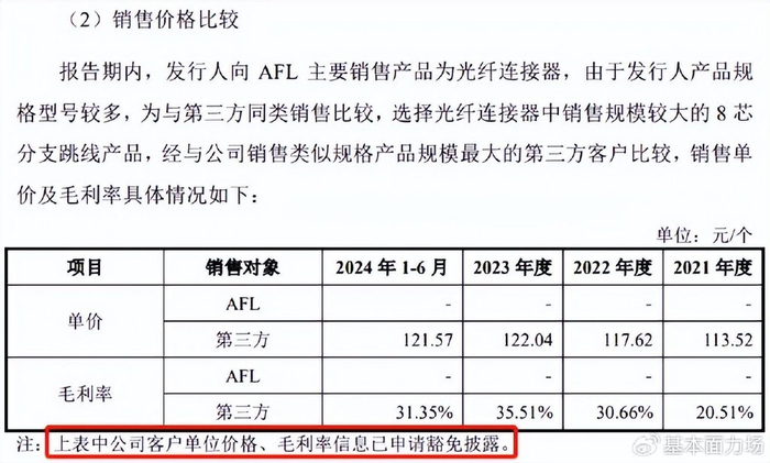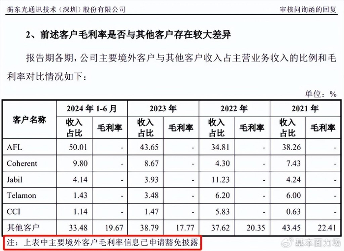 有一些细节,是力场君认为值得关注的,在蘅东光公布的《审核问询函的回复》中,监管部门问询到了“签署客户毛利率是否与其他客户存在较大差异”,还有关于针对AFL的售价与其他客户进行比较等信息,蘅东光对此都申请了豁免披露。