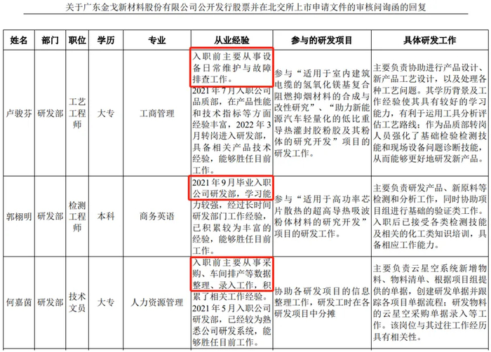 但力场君知道的是,研发人员的团队质量及相关信息披露,是监管部门审查的重点,这从金戈新材两轮问询函都受到关注也能看出来。