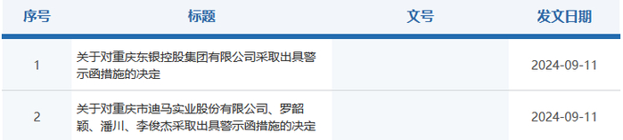 中新经纬9月11日电 据重庆证监局网站11日消息,重庆市迪马实业股份有限公司(下称“迪马股份”)及控股股东重庆东银控股集团有限公司(下称“东银控股”)被出具警示函。
