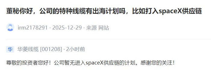 【V观财报丨华菱线缆:公司暂无进入spaceX供应链的计划】华菱线缆1月21日在投资者互动平台回复提问表示,公司暂无进入spaceX供应链的计划。(中新经纬APP)