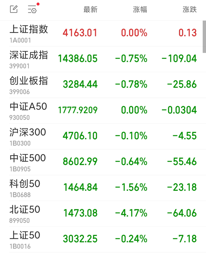 中新经纬3月2日电 周一早盘,A股三大指数低开后冲高回落。截至午间收盘,上证指数基本收平,报4163.01点;深证成指跌0.75%,报14386.05点;创业板指跌0.78%,报3284.44点。