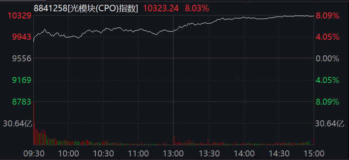 盘面上,CPO(光模块)指数盘中创新高,截至收盘该指数暴涨8.03%。
