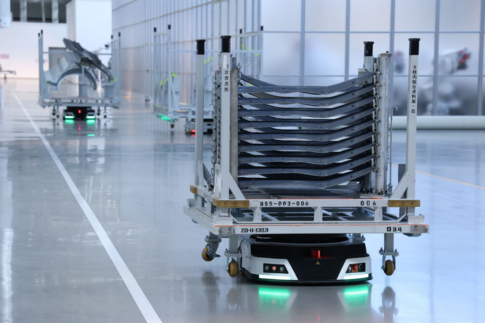 工厂车间里的物流机器人 受访者供图参观过程中,车间部分是最受欢迎的环节。整洁的车间里,机器人的数量比真人员工多得多,透明的墙壁和大量的窗户让汽车生产过程一览无余。看着形似大号扫地机器人的物流机器人忙碌搬运车身零件,巨大的机械臂上下挥舞安装车门,李华和她的老伴比年轻游客还要兴奋。