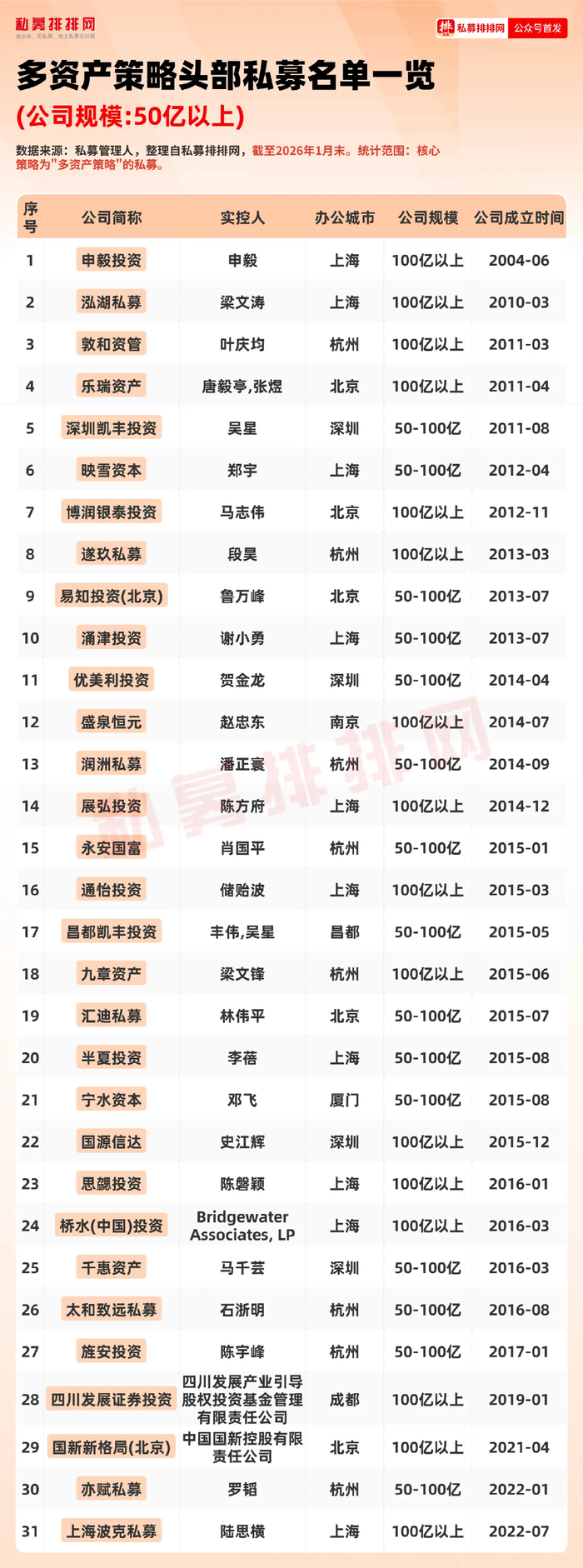 根据私募排排网统计,截至2026年1月末,以多资产策略为核心的私募达901家,在五大私募一级策略中仅次于股票策略,其中管理规模在50亿以上的多资产策略私募有31家,包括百亿私募泓湖私募、敦和资管、乐瑞资产、桥水(中国)投资等等。