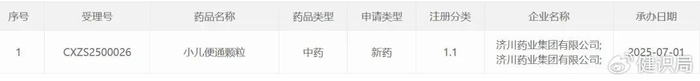 近日,济川药业收到国家药品监督管理局签发的1.1类中药创新药小儿便通颗粒申报上市许可的《受理通知书》。小儿便通颗粒来源于名医验方,具有健脾和胃、行气导滞的功效,用于小儿便秘,中医辨证属食积证者。