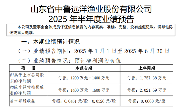 7月9日,山东省中鲁远洋渔业股份有限公司(证券简称中鲁B,代码200992)发布2025年半年度业绩预告。