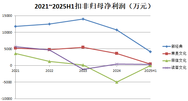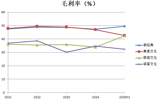综合来看,新经典毛利率相对最高最为稳定;荣信文化稳中有升;果麦文化之前毛利率与新经典相当,2025年上半年有所下滑;读客文化在毛利率方面相对表现最差。