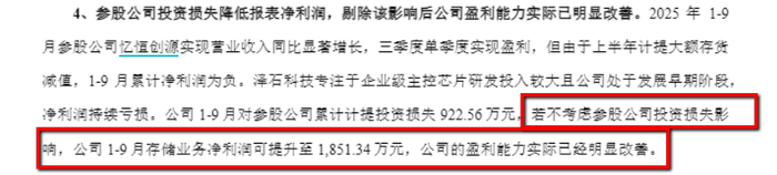 数据来源:三季报首先,投资收益变成了同有科技的“拖油瓶”。报告显示,公司1-9月投资收益为-915.44万元,同比暴跌174.99%。主要原因是参股公司忆恒创源和泽石科技带来的投资损失。忆恒创源虽三季度单季盈利,但因上半年计提大额存货减值,累计仍亏损,;泽石科技则处于研发投入期,后续还将大规模投入,短期内想解决亏损难度不小。同有科技也承认,若剔除这部分影响,存储业务净利润可达1,851.34万元。