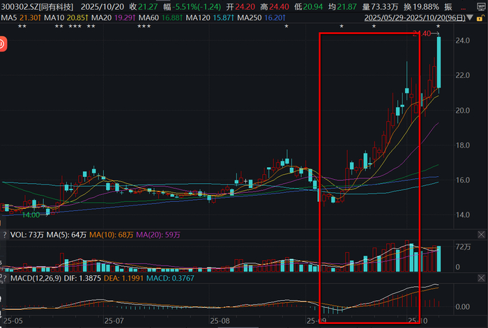 对于这份亮眼的三季报成绩单,市场反应耐人寻味。10月20日,同有科技股价高开7.51%,但旋即遭遇抛压股价一路震荡下行,最终走出了一根 “高开低走”阴线,收盘下跌5.51%,报收21.27元/股。