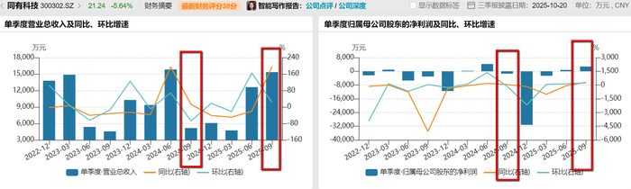 核心变化在于盈利能力的逆转以及现金流改善。半年报时,同有科技净利润处于同比大幅下滑状态,约亏损1838万元。三季报凭借单季的出色表现,将累计净利润扭亏为盈。另外,三季报显示公司经营活动产生的现金流量净额为-2,440万元,虽然仍为负值,但相比上年同期的-9,751万元,改善了74.98%。说明销售回款和采购付款管理有所优化。