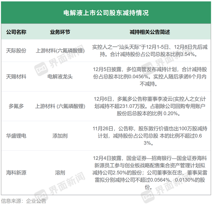 据界面新闻记者不完全统计,11月底以来,已有包括华盛锂电(688353.SH)、天际股份(002759.SZ)、海科新能(301292.SZ)、天赐材料(002709.SZ)和多氟多(002407.SZ)在内的多家电解液行业上市公司的股东、高管等计划减持。
