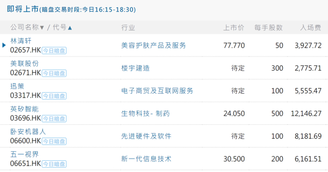 图/港交所6个IPO其中,英矽智能高开报32.5港元/股,市值约180亿港元;五一视界报33港元/股,市值为134亿港元;美联股份同样高开报8港元/股,市值约10亿港元;卧安机器人和迅策开盘较定价无波动,市值分别为164亿港元和155亿港元;林清轩则略低开报77.75港元/股,总市值约110亿港元。