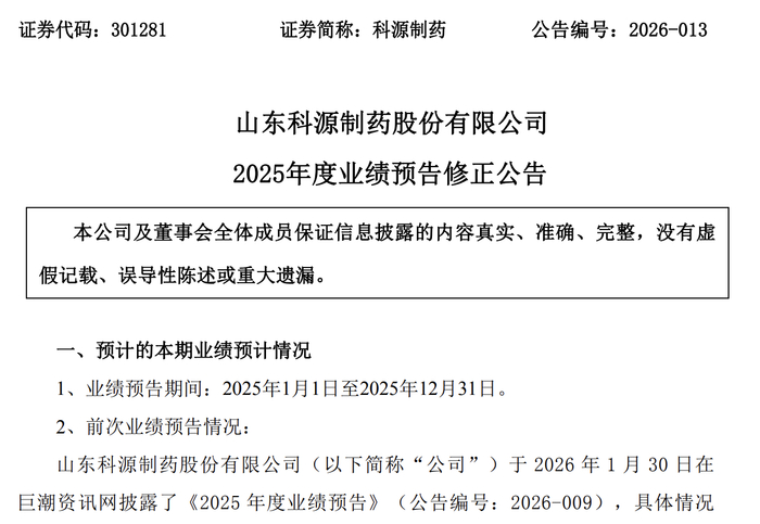 2月24日,山东科源制药股份有限公司(代码:301281;简称:科源制药)发布2025年度业绩预告修正公告,将全年净利润预期大幅下修。