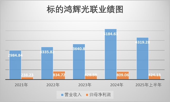 鸿辉光联前身为美国光联在华镀膜部门,2021年被鸿辉光通收购,估值5年暴涨近4倍,已接近母公司鸿辉光通的总市值(约3.95亿元)。鸿辉光联被收购后业绩未达承诺:2021年至2025年上半年累计净利润不足3000万元,与承诺的8063万元(2021年至2026年间累计净利润)差距悬殊。