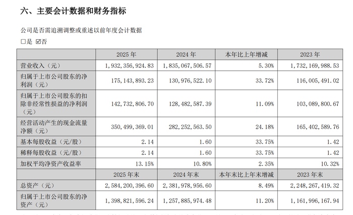据年报显示,公司2025年经营活动产生的现金流量净额达3.50亿元,同比增长24.18%。截至报告期末,公司总资产为25.84亿元,较上年末增长8.5%;归母净资产为13.99亿元,较上年末增长11.2%。