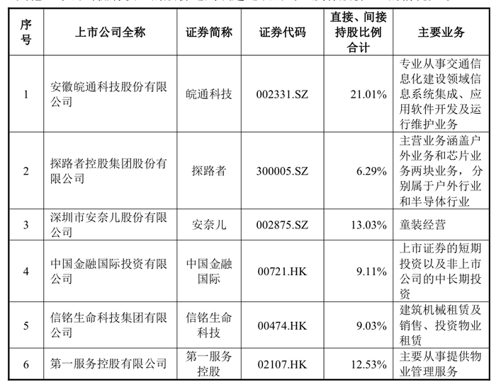 来源:公告除上述两家公司外,黄涛还持有探路者(300005.SZ)6.29%股权、中国金融国际(00721.HK)9.11%股权、信铭生命科技(00474.HK)9.03%股权、第一服务控股(02107.HK)12.53%股权,以及农银人寿保险股份有限公司11.65%的股份。