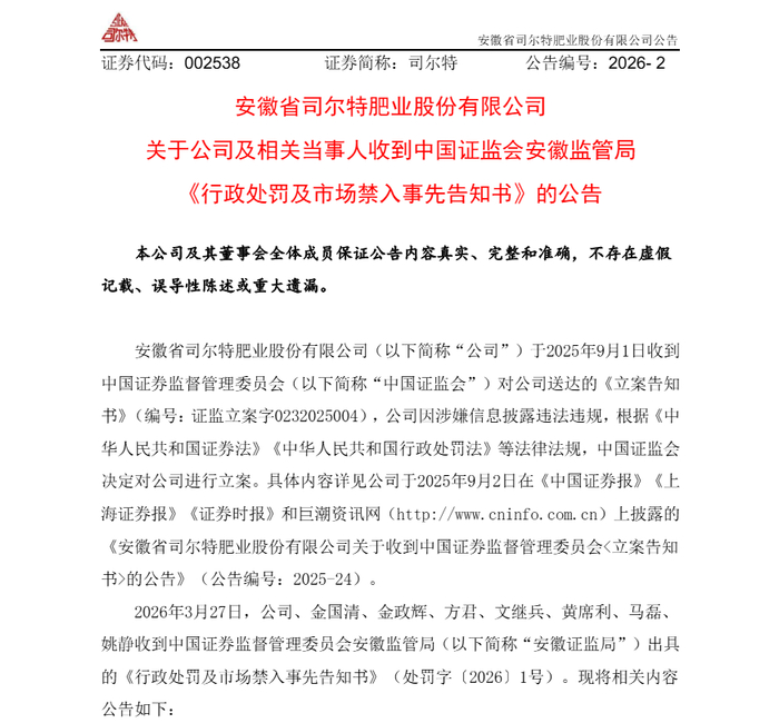 司尔特(002538)3月27日晚间公告,公司及相关当事人收到安徽证监局出具的《行政处罚及市场禁入事先告知书》,认定公司2021年、2023年年报存在虚假记载。