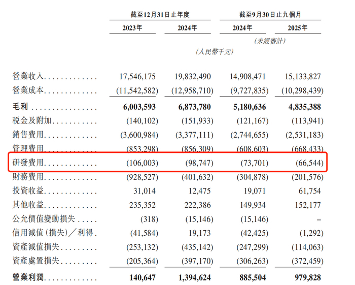 2023年至2025年前9个月,其研发费用从1.06亿元降至0.67亿元,研发费用率不足0.5%。
