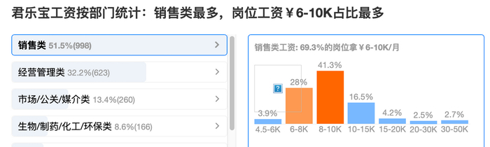 职友集数据显示,君乐宝工资按部门统计,销售类最多,岗位工资6—10K占比最多,低于行业平均水平。