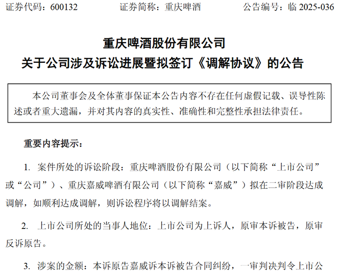 经重庆高级人民法院的调解,此次重庆啤酒和嘉威啤酒协商拟签订《调解协议》,协议包括:重庆啤酒或其子公司向嘉威啤酒一次性支付截至2025年12月31日前的全部量价差结算款人民币1亿元(不含税);就重庆啤酒与嘉威啤酒2026年至2028年期间产品包销方面的合作方式进行约定,以及约定嘉威啤酒分红等相关事宜。