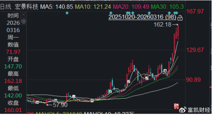 3月16日,宏景科技股价继续上涨。截至16日收盘,宏景科技当日上涨4.58%,收盘价为160.01元/股,盘中股价最高触及162.18元/股,股价创历史新高。