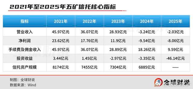 2026年1月中旬,五矿资本披露了五矿信托2025年度未经审计财务报表,数据显示,五矿信托全年营业收入为-2.03亿元,净利润为-8.06亿元。