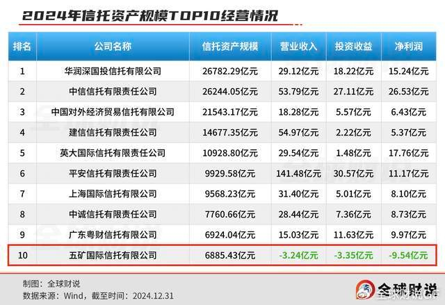 但短短三年间,公司业绩上演“高台跳水”,2024年营业收入为-3.24亿元,净利润为-9.54亿元。Wind数据显示,五矿信托在57家信托公司中营收垫底,也成是唯一一家亏损的头部机构。