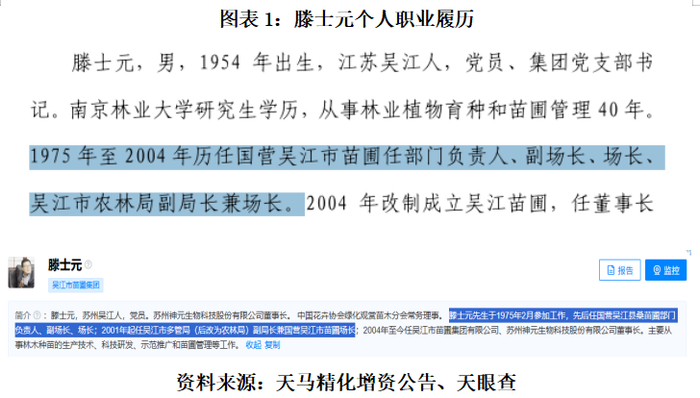 据2014年天马精化(002453.SZ)与苏州神元生物科技股份有限公司(滕士元实控企业,下称“神元生物”)的一份增资公告及天眼查显示,1975—2004年,滕士元在国营吴江市苗圃历任部门负责人、副场长、场长;2001年起任吴江市农林局副局长兼国营吴江市苗圃场长。
