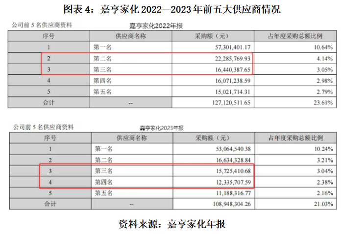 但据嘉亨家化2022年年报,嘉亨家化对未具名的第二大、第三大供应商的采购金额分别为2228.58万元、1644.04万元,与江天科技披露的销售数据存在13.41万元、571.13万元的差额。